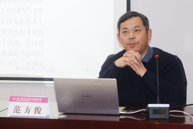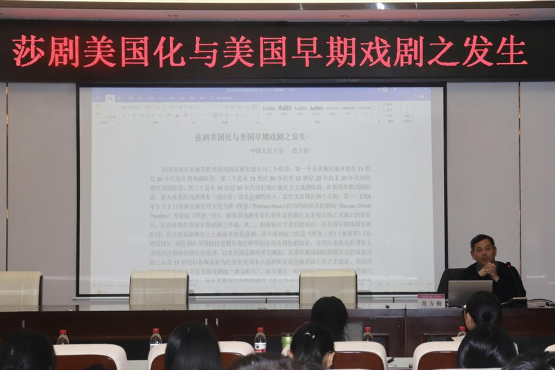 12月19日,中国人民大学范方俊教授应邀为我院师生作题为“莎剧美国化与美国早期戏剧之发生”的专题讲座。讲座由刘明录教授主持,学院师生代表80余人参加。