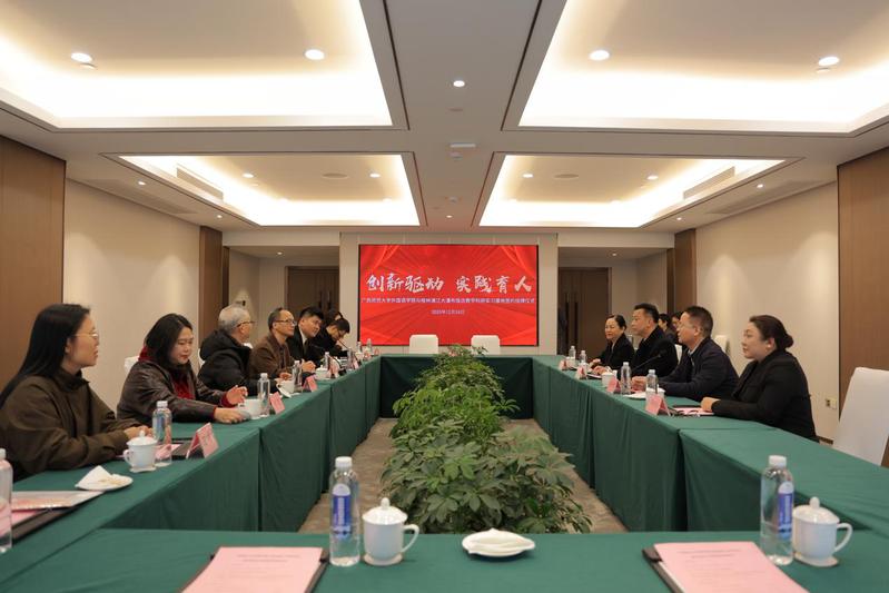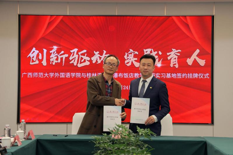 2025年12月24日下午,“创新驱动,实践育人”——广西师范大学外国语学院与桂林漓江大瀑布饭店教学科研实习基地签约挂牌仪式在漓江大瀑布饭店举行。