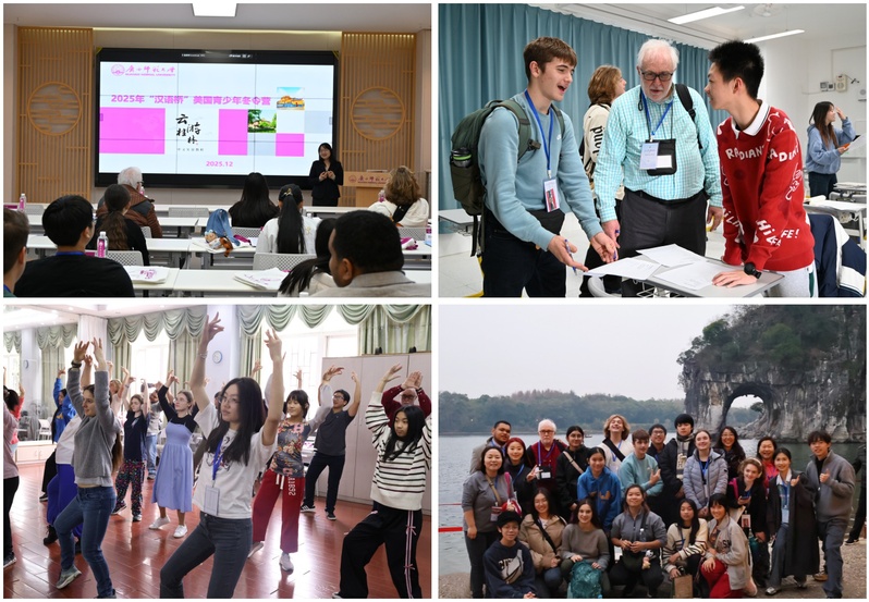 近日,由外国语学院承办的2025年“汉语桥”美国青少年冬令营圆满结营。来自美国的20名师生在为期6天的活动中,深入体验了桂林的自然风光与人文底蕴,完成了一次以桂林山水为课堂、以文化体验为读本的深度研学之旅。
