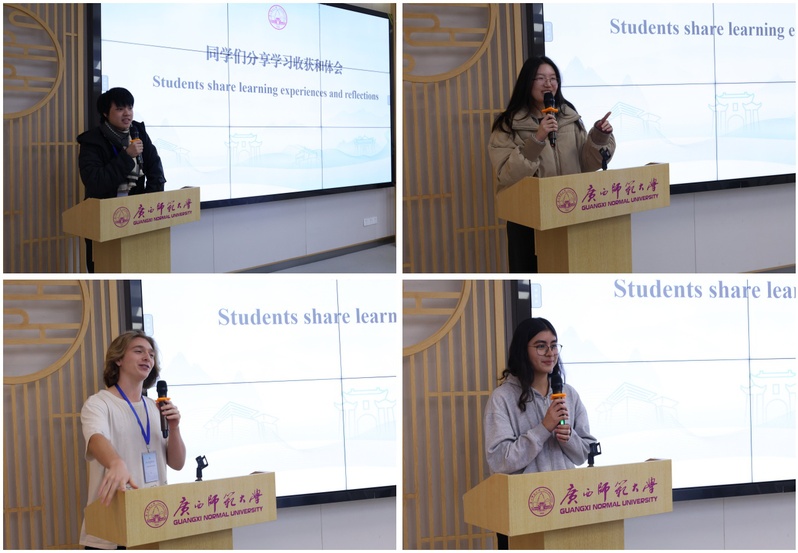 营员代表先后发言,用中英文分享了他们的所思所获。他们在发言中表示,此行不仅亲身感受到了桂林山水甲天下的诗意画卷,还在语言文化交流过程中收获了真挚友谊,感受到了中国传统文化的博大精深以及中国同龄人的热情友善,并希望有机会再次来广西师范大学学习深造。