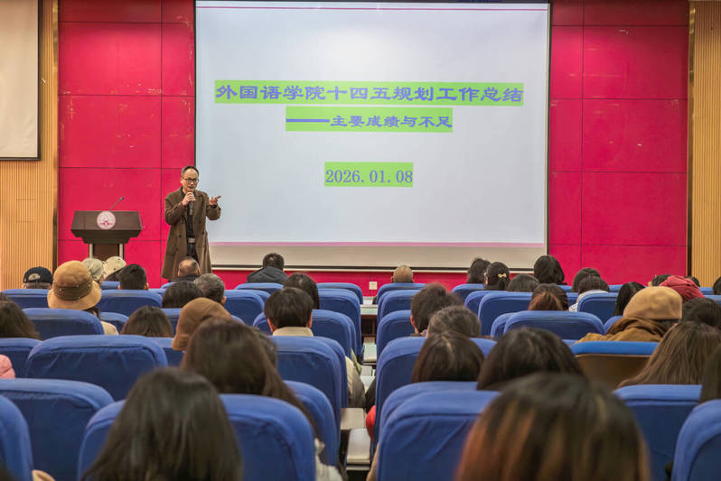 学院院长何彦诚做《锚定目标 笃行不怠——“十四五”总结与“十五五”展望》专题报告。他系统回顾了学院“十四五”期间在学科建设、人才培养、科学研究、社会服务、国际交流等方面取得的显著成就。同时,何彦诚院长立足发展实际,客观分析新时代外语学科面临的机遇与挑战,基于“十四五”发展短板,科学谋划学院“十五五”改革举措。他强调:全院教职工要聚焦高质量发展主线,进一步凝练学科特色、补齐短板弱项,深化交叉融合,持续提升外语人才培养质量与学科影响力,共同开创学院发展新局面。