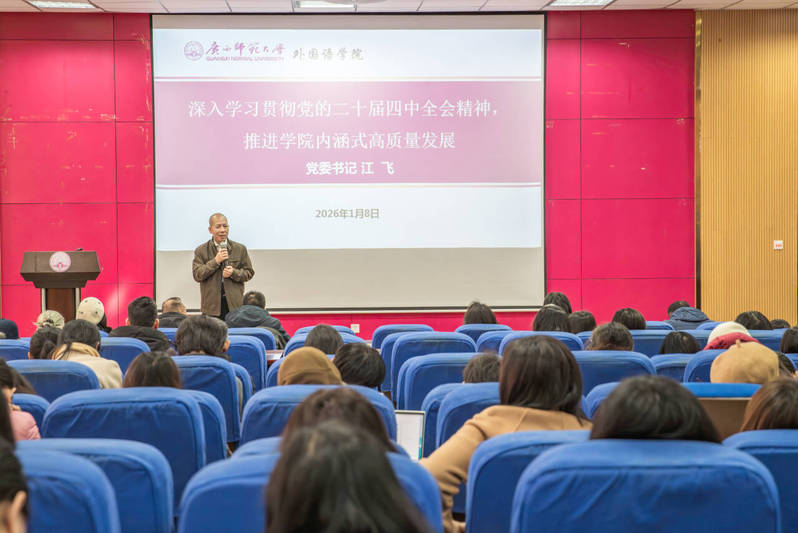 学院党委书记江飞以《深入学习贯彻党的二十届四中全会精神 推进学院内涵式高质量发展》为题,面向全体教师进行宣讲。他强调,党的二十届四中全会确立的核心要义与战略部署,是学院今后一段时期改革发展的根本遵循与行动指南。全体教职工要切实提高政治站位,将学习贯彻全会精神与落实立德树人根本任务紧密结合起来,自觉把外语学科建设、教育教学研究与国家战略、时代需求相贯通,着力培养堪当民族复兴大任、精通外语、融通中外的高素质人才。