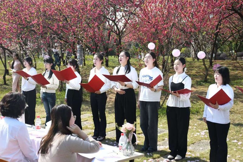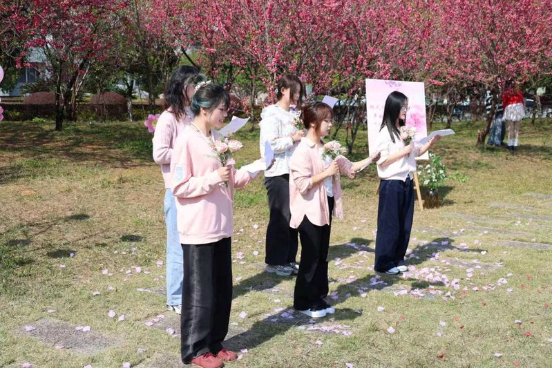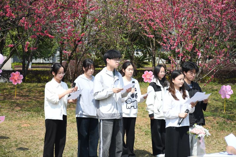 风起雁栖湖畔,绿生桃李枝头,3月13日下午,广西师范大学外国语学院在雁山校区行政南楼前桃花林举办“桃夭诗韵·声动雁栖”外文诗歌诵读会。