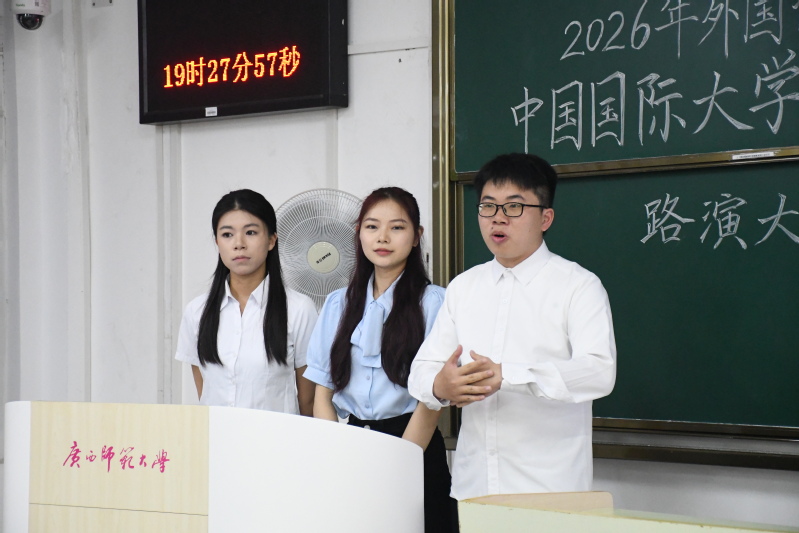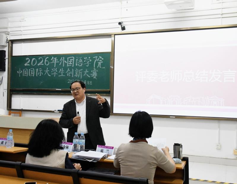 为提升学生创新实践能力,激发创新精神与创业意识,4月8日,外国语学院在雁山校区文科楼一区501、502、503教室同步举办2026年度中国国际大学生创新大赛院级路演活动。本次路演特邀外国语学院副院长宁见红、广西临界动漫公司总经理张华勇、广西三点一四教育科技有限公司董事长彭伍新、桂林华诺威基因药业股份有限公司产品研发部总监杨冠鹏、桂林金马学校校长黄梅、学院团委书记马培祯、兄弟学院教师代表、各系教师代表担任评委。