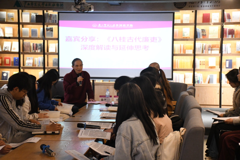 为深入推进校园廉洁文化建设,厚植青年学子廉洁底色,引导外院学子将廉洁精神与专业学习、成长成才相结合,近日,外国语学院关工委举办“以书为媒悟廉洁 青春践行守初心——‘荐’读经典 ‘阅’见未来”读书分享会。本次分享会特邀广西师范大学关工委副主任、“五老”宣讲团成员徐坤华老师作为主讲嘉宾,学院党委书记江飞、副书记赵萌萌及学生代表共同参与。