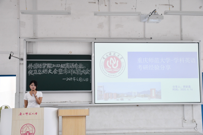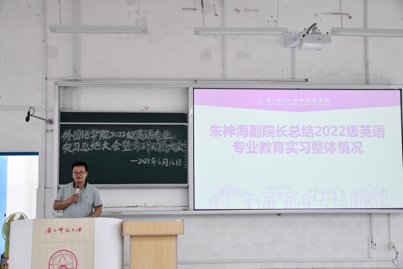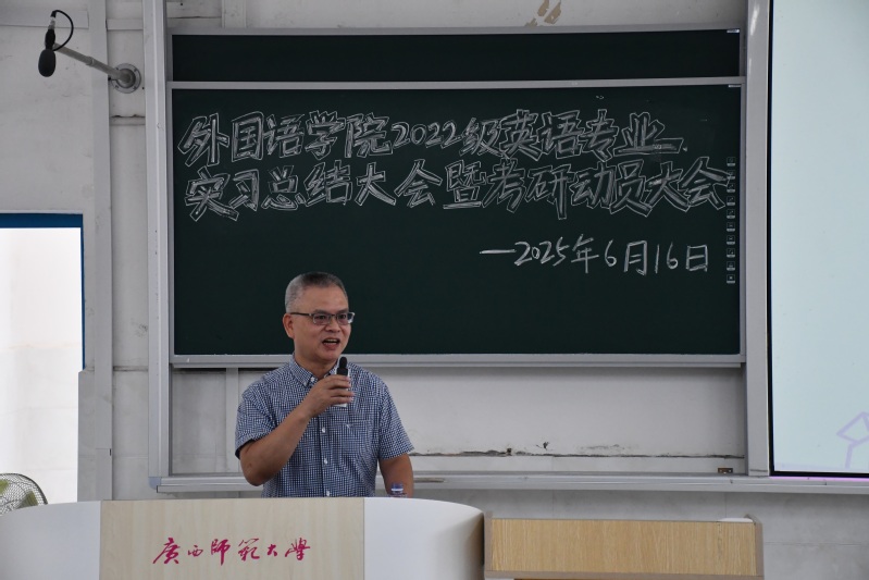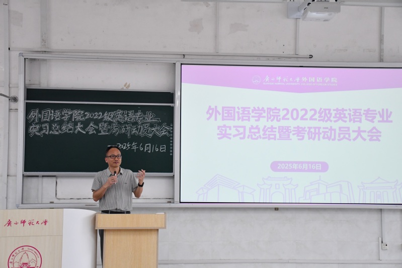 6月16日下午,我院于雁山校区文科楼一区108教室召开2022级英语专业实习总结暨考研动员大会。学院党委书记江飞、院长何彦诚、党委副书记赵萌萌、副院长朱神海、英语系副主任颜东和实习指导老师代表出席本次大会,2022级英语专业全体学生参会。