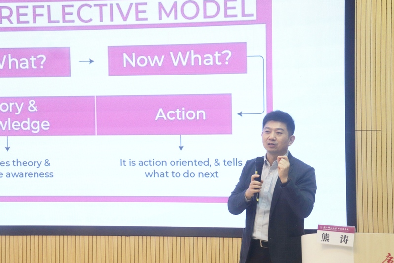 在题为“在反思和实践中促进外语教师发展”的讲座中,熊涛教授从“什么是教师反思”问题切入,进而指出教师反思并非简单的教学回顾,而是对自我认知及教学情境的批判性审视与建设性重构。讲座围绕“反思什么”与“如何反思”两大部分展开,引入了Farrell提出的五层反思框架,并重点展示了Rolfe的“三问法”与Gibbs的反思循环两大实用工具,演示如何借助工具进行教学反思,最终实现“计划-行动-审视-改进”的闭环。