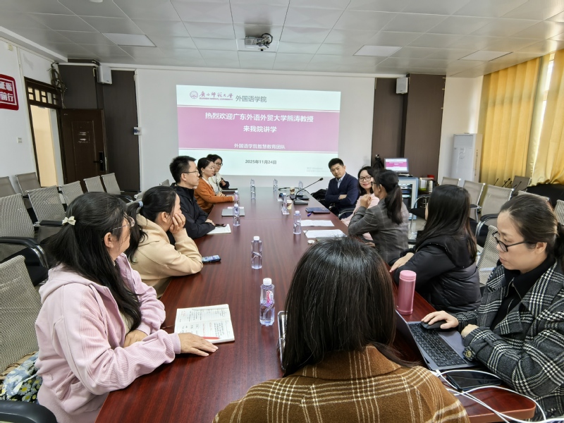 11月24日,广东外语外贸大学熊涛教授应邀来我院讲学,分别在雁山校区和育才校区开展题为“在反思和实践中促进外语教师发展”和“探索中国职前英语教师的情感图景:差异性与影响因素”的专题讲座,讲座由宁见红副院长主持,学院师生代表120余人参加。