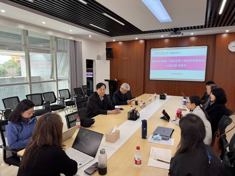 近日,外国语学院在雁山校区行政南楼231会议室举办2026年国家社会科学基金(东亚文学)项目申报辅导会。会议由朝鲜语专业学科带头人李永男教授主持,特邀山东大学中日韩合作研究中心主任、国家社科基金重大项目首席专家牛林杰教授莅临指导,朝鲜语专业、日语专业教师代表参会。
